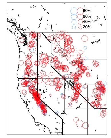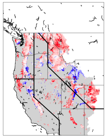 The figure to the right shows simulated snowpack declines. As with the previous figure, reds denote decreases in SWE and blues increases. The figure was created using the Variable Infiltration Capacity Hydrologic Model (VIC), the brainchild of former CIRC researcher Dennis Lettenmaier. Using the Hamlet and Lettenmaier dataset, CIRC researchers calculated SWE via a VIC simulation for the years 1955–2014. The VIC simulations took historic climate data—how warm it was and how much precipitation fell—and then deduced that if you had these conditions you would get such and such amounts of SWE at the different elevation bands modeled. The hydrologic model was used in part to corroborate the data-crunching that produced the figure above. It was also used to determine how much SWE has been lost in the American West from 1955 to 2014. That number, as you might imagine, is large. From 1955 to 2014, the snowpack equivalent of 25 to 50 cubic kilometers of water (roughly 6–12 cubic miles) have dissapeared from the American West, according to CIRC research. This is comparable to the water volume of a full Lake Mead, which can hold up to 32 km3 (not quite 8 cubic miles) of water (Mote et al. 2018). This Image is licensed under Creative Commons Attribution 4.0 International (CC BY 4.0).