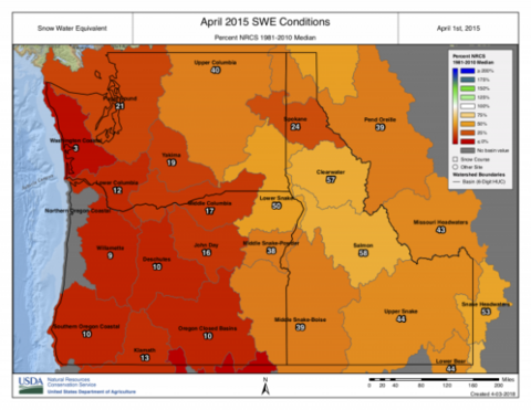 This image shows the Pacific Northwest's April 1st, 2015 median snow water equivalent compared to historical baseline 1981–2010. Cool colors (greens and blues) represent SWE levels above normal (i.e. what was normal for the recorded years 1981–2010). Warmer colors (the oranges and reds) represent lower-than-normal SWE levels. Obviously, there is a lot of red and orange on this map. (Image Credit: Natural Resources Conservation Service.